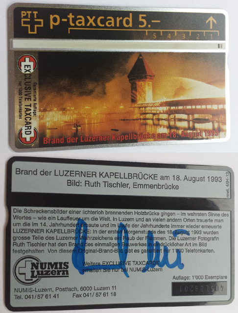 Exclusive Taxcard - Brand der Kapellbrücke Luzern - mit Originalunterschrift vom ehemaligen Verkehrsdirektor Kurt H. Illi
