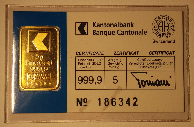 Legierung: Gold 999/1000Gewicht: 5 g>> Goldbarren-Verpackung hat Knick, dort bei der Serien-Nummer, daher diese Verfärbungnur 1 x lieferbar