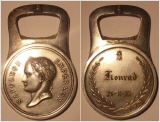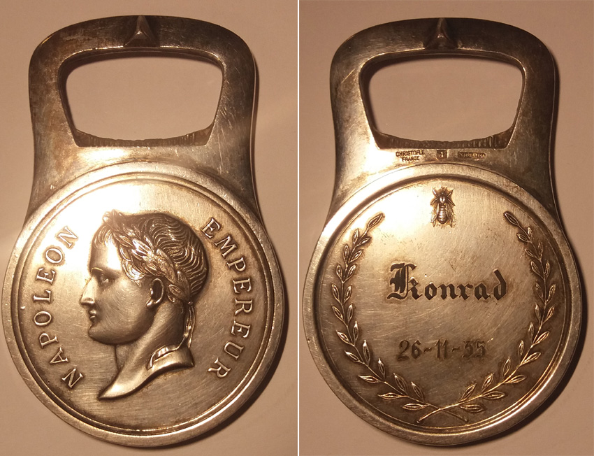 ** Flaschenöffner von Christofle. Das edle Design zeigt auf der Vorderseite das reliefartige Profil von Kaiser Napoleon, verziert mit dem charakteristischen Lorbeerkranz und der Gravur „Napoleon Empereur“.