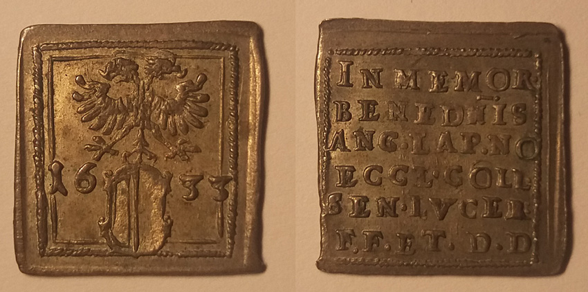 Durchmesser: 11 mmGewicht: ca. 1,02 g >> Gedenkklippe 1633 auf die Grundsteinlegung der neuen Hofkirche >> sehr seltenSie erhalten die abgebildete Münze.