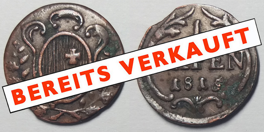 Legierung: KupferDurchmesser: 16 mmGewicht: ca. 1.40 g AUSVERKAUFT / SOLD OUT / EPUISEE (vom 1 Rappen 1815 gibt es diverse Varianten)