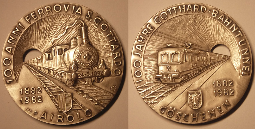 100 Jahre Gotthard-Bahntunnel Silbermedaille mit Tunnel-Loch !! Legierung: 999/1000 SilberGewicht: 71,8 GrammDurchmesser: 50 mm nur 1 x lieferbar