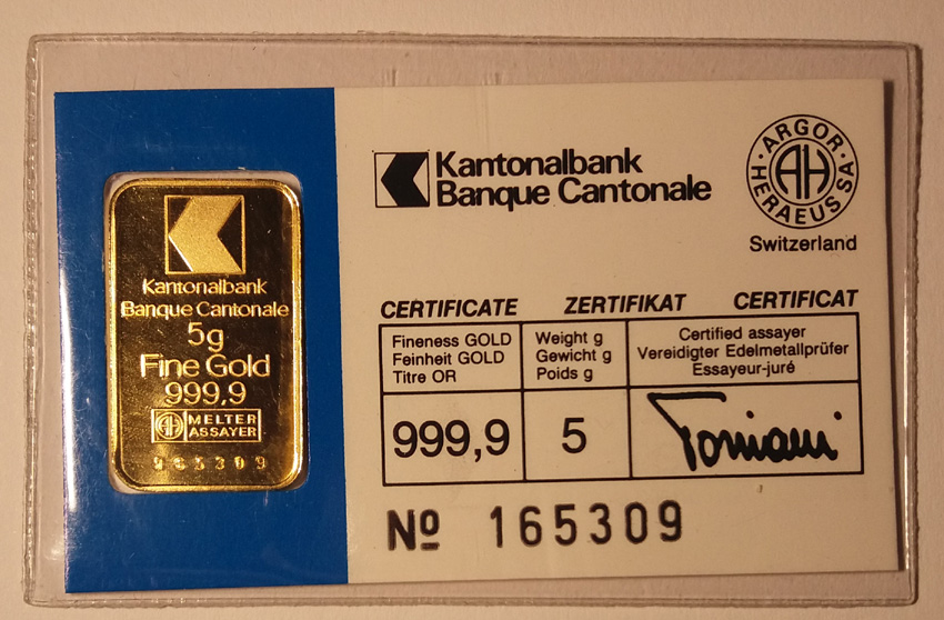 Legierung: Gold 999/1000Gewicht: 5 g>> Goldbarren rutscht in Packung hin- und her - hat hinten 2 angelaufene Punktenur 1 x lieferbar