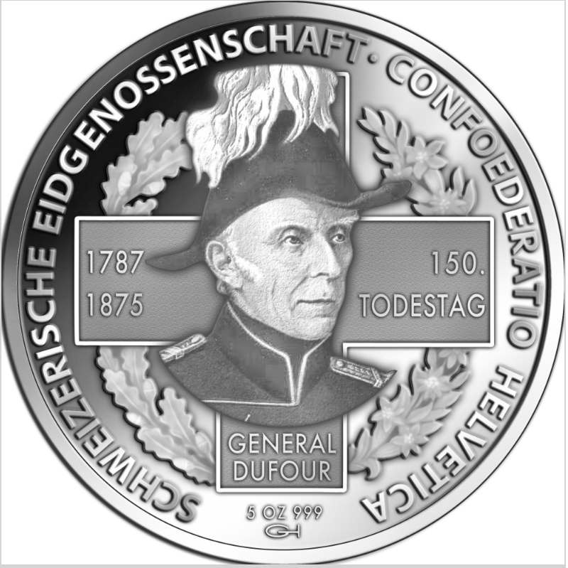 Motiv: 150. Todestag General DufourLegierung: Silber 999/1000 Qualität: Polierte PlatteDurchmesser: 1 Unze = 33 mm Durchmesser: 5 Unzen = 64 mm