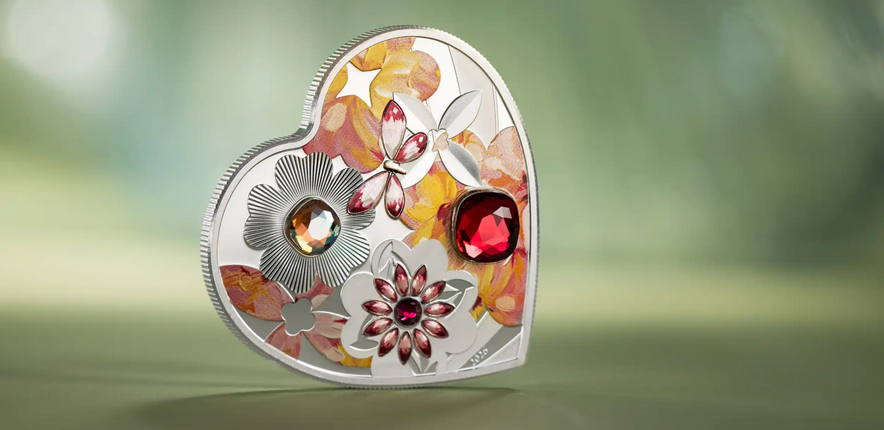 Drei funkelnde Kristalle setzen edle Akzente und verleihen der Münze eine besondere Brillanz, während der Polierten Platten-Hintergrund die feinen Details meisterhaft hervorhebt. Die Kombination aus floralen Motiven, sanfter Befärbung und edlen Kristallelementen macht diese Silber-Herz-Münze zu einem einzigartigen Geschenk für romantische und besondere Anlässe.