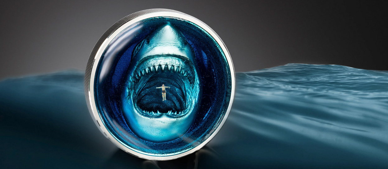 Geschichten über kolossale Ungeheuer, tiefe Unterwasserschluchten und gigantische Meeresbewohner erzählen von den Geheimnissen des Ozeans. Für manche ist dieses Unterwasserreich keine blosse Science-Fiction, sondern eine beunruhigende Realität. Die Thalassophobie, eine tiefsitzende Angst vor ausgedehnten Gewässern, vernichtet Träume vom Leben am Meer, gemütlichen Strandbesuchen und vergnüglichen Bootsfahrten. Man denke nur an die abschreckende Wirkung des filmischen Meereshorrors – die ikonische «Der weisse Hai»-Reihe, «Deep Blue Sea» und «Open Water». Beispiele für den nasskalten Griff der See nach unserer Vorstellungskraft. Die Münze zeigt einen riesigen Hai, der aus den Tiefen des Ozeans aufsteigt, unbemerkt von dem gemächlich dahintreibenden Schwimmer. Dank einer raffinierten Kombination aus invertiertem Hochrelief, Farbe und Emaille wirkt die Szene täuschend echt.