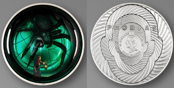 Diese Münze spielt auf eindrucksvolle Weise mit dem Thema. Aus einer konkaven Form kommt in Übergrösse eine furchteinflössende Spinne hervor. Nur ein kleiner Teil eines behaarten Beines dringt durch die Emaille, welche das Monster vom unschuldigen Mädchen trennt. Diese Ausgabe polarisiert und fasziniert zugleich.