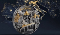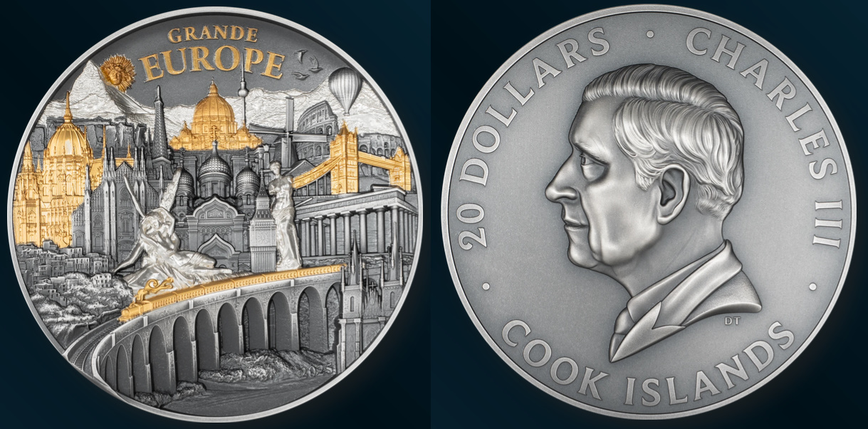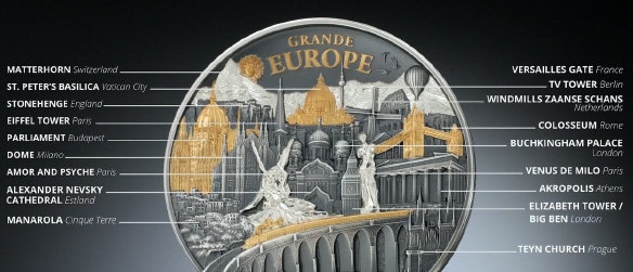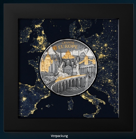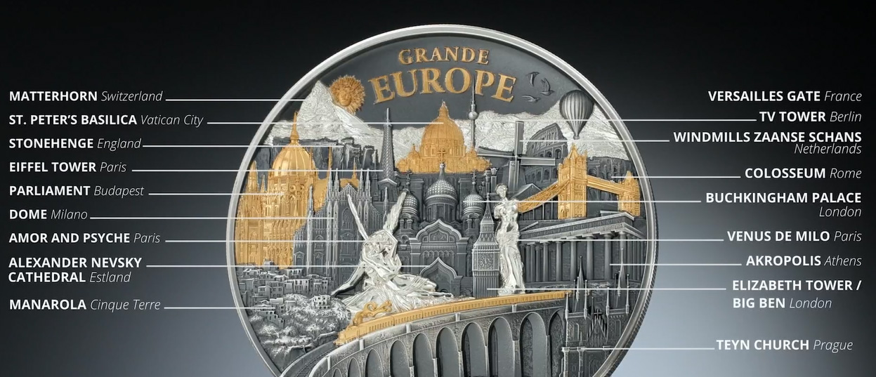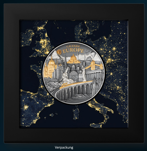 Die Münze vereint mehr als 20 europäische Sehenswürdigkeiten, meisterhaft in Antique finish mit Proof-Elementen und edler Teilvergoldung gestaltet. Das Zusammenspiel dieser Veredelungen erzeugt einen lebendigen 3D-Effekt, der den Blick des Betrachters immer wieder auf neue Einzelheiten lenkt. Vergoldete Akzente heben markante Elemente hervor, wie die glänzenden Kuppeln und Brücken, während das Antique finish den restlichen Details Tiefe und Textur verleiht.