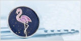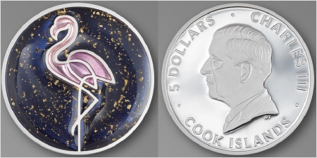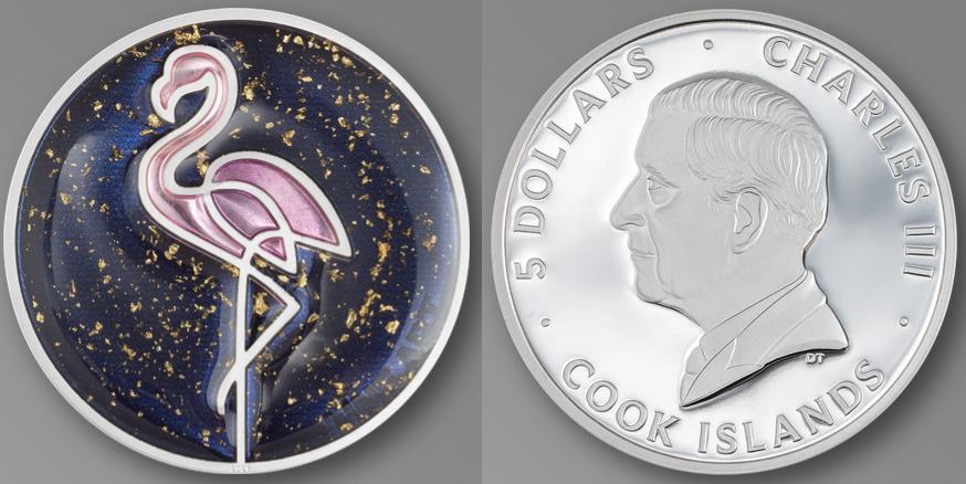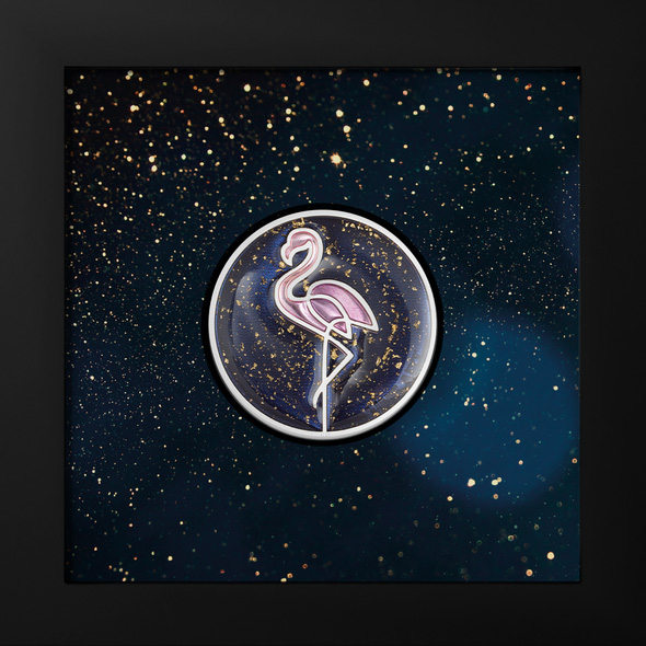 Diese moderne Münze entstand in Anlehnung an den Art-Déco-Stil. Dieser zeichnet sich durch geometrische Vereinfachung, dekorative Muster und besondere Farbgebung aus. Im Zentrum der Münze steht ein stark stilisierter Flamingo mit pink gefärbter Silhouette. Um die Eleganz der Ausgabe zu betonen, ist sie komplett mit Emaille überzogen. Ergänzt wird dieses Stilelement durch integrierte Goldflocken, die in der Emaille zu schwimmen scheinen und der Münze ein luxuriöses, dekoratives Aussehen verleihen. Alles zusammen ergibt ein kontrastreiches, modernes Kunstwerk.