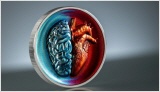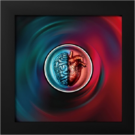 Die konkave Form verstärkt die Tiefe der Münze und zieht den Betrachter in die Spannung zwischen Vernunft und Gefühl hinein. Der menschliche Kopf ist in kühlen, rationalen Tönen dargestellt, die Logik und Intellekt symbolisieren, während das Herz in warmen, satten Farben leuchtet und für Leidenschaft und Intuition steht. Der bewusste Kontrast in den Farben verstärkt den Konflikt – kalt gegen warm, Verstand gegen Seele – und schafft ein visuell beeindruckendes und zum Nachdenken anregendes Stück.