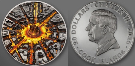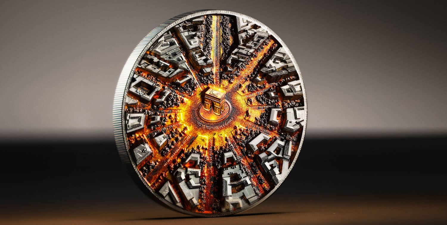 Besonders beeindruckend ist diese turbulente Kulisse bei Nacht. Und genau diese pulsierende Magie der Pariser Nacht fängt die Münze ein. Eine Momentaufnahme aus der Vogelperspektive. Eine Symbiose aus Architektur, Strassen und nächtlichem Glanz. Wie Feuerblitze treffen sich die Strassenzüge am zentralen Punkt – dem Arc de Triomphe – während die Gebäude sehr detailliert und realitätsnah in der Seitenansicht dargestellt werden. Die illuminierten Strassenzüge durchziehen die Münze wie Lebensadern, die die nächtliche Lebendigkeit von Paris widerspiegeln.