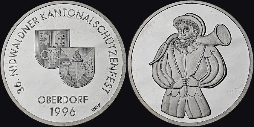 Schützenmedaille 1996 36. Nidwaldner Kantonal Schützenfest OberdorfAusgabejahr: 1996Legierung: Silber 900/1000Erhaltung: vorzüglichDurchmesser: 33 mmGewicht: 15 g